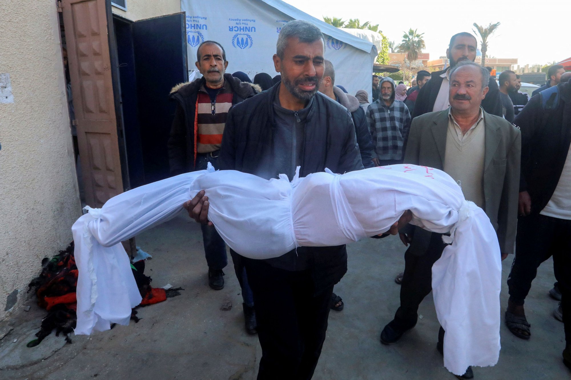 Ιορδανός γιατρός που εργάζεται στο Νοσοκομείο Μαρτύρων του Αλ-Άκσα στην Ντέιρ ελ-Μπάλαχ κλαίει με πικρία καθώς τα πτώματα των θυμάτων ισραηλινής επίθεσης προετοιμάζονται για ταφή.