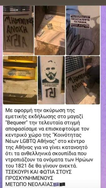 «Με αφορμή την ακύρωση της εμετικής εκδήλωσης στο μαγαζί “Bequeer” την τελευταία στιγμή αποφασίσαμε να επισκεφτούμε τον κεντρικό χώρο της Κοινότητας Νέων LGTBQ Αθήνας στο κέντρο της Αθήνας για να γίνει κατανοητό ότι τα ανθελληνικά σκουπίδια που ντροπιάζουν τα ονόματα των Ηρώων του 1821 δε θα γίνουν ανεκτά. Τσεκούρι και φωτιά στους προσκυνημένους. Μέτωπο Νεολαίας», φαίνεται ότι έγραψε το Μέτωπο Νεολαίας.