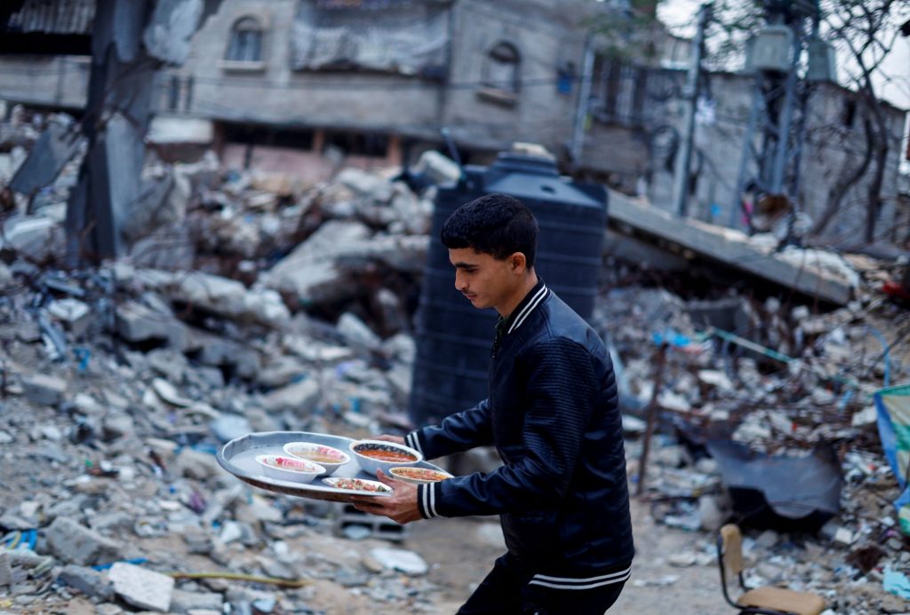 Παλαιστίνιος μεταφέρει φαγητό για το Ιφτάρ ανάμεσα σε χαλάσματα στη Γάζα.