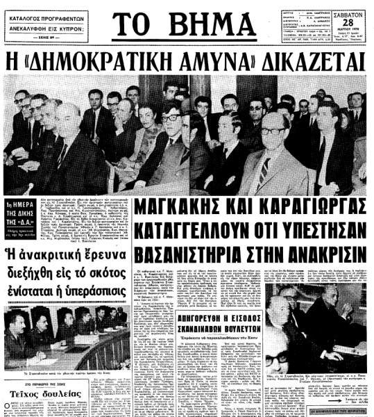 Στο φύλλο του «Βήματος» που είχε κυκλοφορήσει την επομένη, το Σάββατο 28 Μαρτίου 1970, υπήρχε εκτενές ρεπορτάζ για την πρώτη ημέρα της δίκης υπό τον τίτλο Η «Δημοκρατική Άμυνα» δικάζεται. Ένας από τους πρωτοσέλιδους τίτλους της εφημερίδας ήταν ο ακόλουθος: Μαγκάκης και Καράγιωργας καταγγέλλουν ότι υπέστησαν βασανιστήρια στην ανάκρισιν. Οι δύο καθηγητές, ο Μαγκάκης και ο επίσης αείμνηστος Σάκης (Διονύσης) Καράγιωργας (1930-1985), με δηλώσεις τους που είχαν αναγνωσθεί ενώπιον του Εκτάκτου Στρατοδικείου Αθηνών, είχαν καταγγείλει τα σωματικά βασανιστήρια που είχαν υποστεί κατά τη διάρκεια των ανακρίσεων.