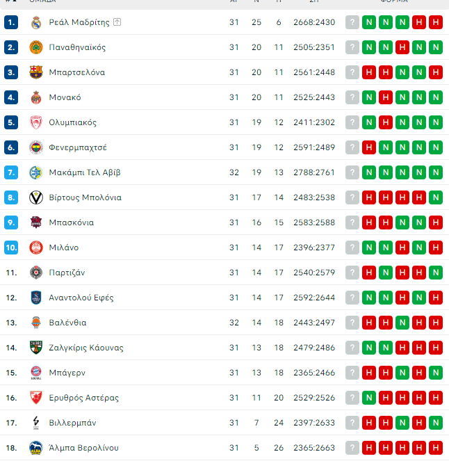 Αναλυτικά η βαθμολογία της Euroleague μετά την νίκη της Μακάμπι: