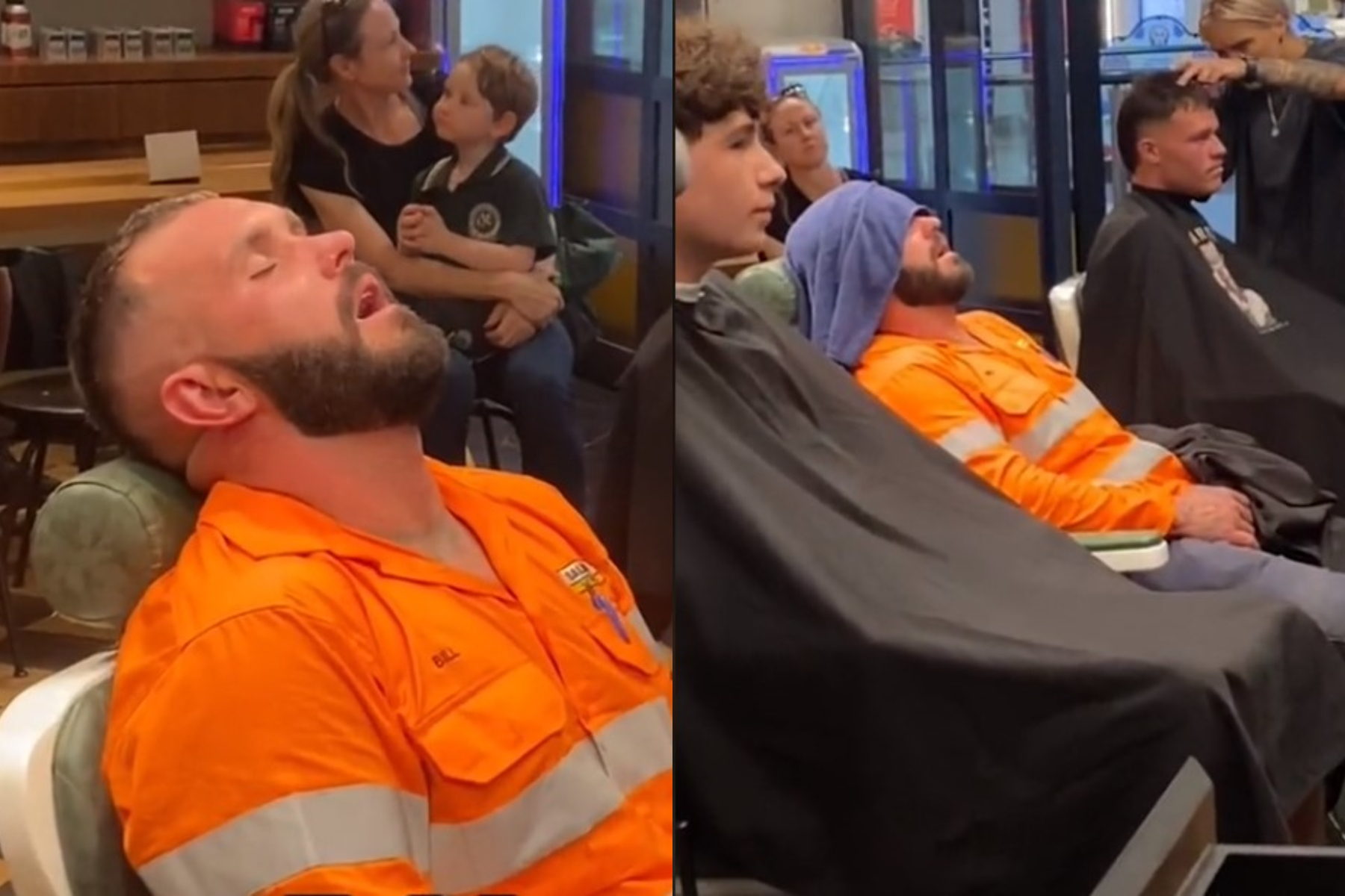Ο Jordan Magasiva, ο οποίος εργάζεται για την Barber Industries στο εμπορικό κέντρο Westfield Kotara στα δυτικά του Newcastle στην Αυστραλία, δημοσίευσε πλάνα του γενειοφόρου άνδρα με την στολή εργασίας του, ο οποίος κοιμόταν με το κεφάλι του ακουμπισμένο προς τα πίσω στην καρέκλα του κουρείου.