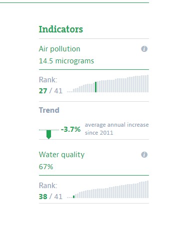 Το επίπεδο των ατμοσφαιρικών PM2.5 – μικροσκοπικά σωματίδια ατμοσφαιρικών ρύπων αρκετά μικρά ώστε να εισέρχονται και να προκαλούν βλάβες στους πνεύμονες – είναι 14,5 μικρογραμμάρια ανά κυβικό μέτρο, ελαφρώς πάνω από τον μέσο όρο του ΟΟΣΑ των 14 μικρογραμμαρίων ανά κυβικό μέτρο.
