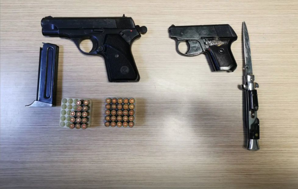 Σε έρευνα που ακολούθησε στην οικία του 38χρονου βρέθηκαν και κατασχέθηκαν ένα πιστόλι με γεμιστήρα των 8 φυσιγγίων, ένα πιστόλι άνευ αριθμού, 30 φυσίγγια, ένα φυσίγγιο πολεμικού όπλου, ένα μαχαίρι – αναδιπλούμενο (στιλέτο) και μία κυνηγετική καραμπίνα.