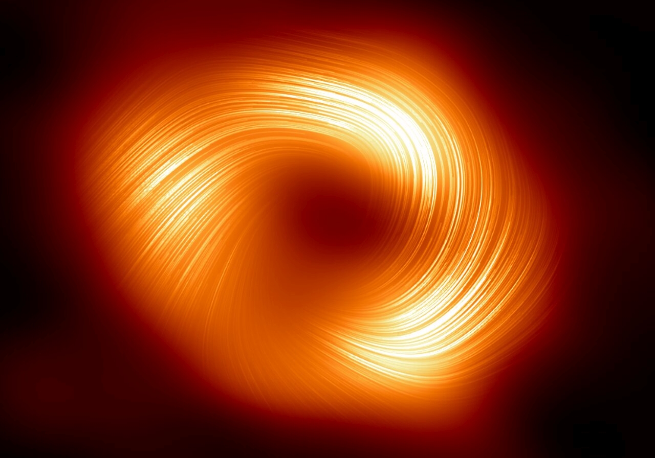Το φως πολώνεται (αλλάζει επίπεδο ταλάντωσης) όταν περνά μέσα από μαγνητικά πεδία, οπότε η εικόνα δείχνει ουσιαστικά τις γραμμές ενός πελώριου μαγνητικού πεδίου που συστρέφονται και σχηματίζουν μια σπείρα γύρω από μια κεντρική σκούρα κηλίδα, η οποία αντιστοιχεί στη σκιά της μαύρης τρύπας.