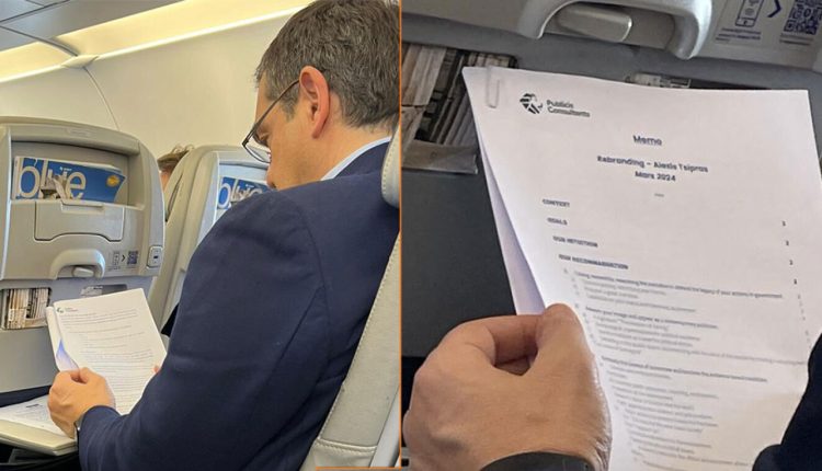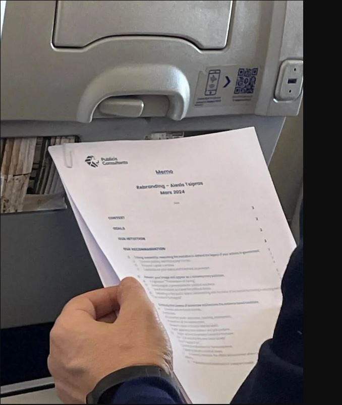 Ταξιδεύοντας στην οικονομική θέση ο Αλέξης Τσίπρας φαίνεται να μελετά ενημερωτικό μιας από τις μεγαλύτερες διαφημιστικές εταιρείες στον κόσμο, με έδρα το Παρίσι, της Publicis Communications, με τίτλο «Rebranding – Alexis Tsipras». Από κάτω γράφει «Mars 2024» (Μάρτιος 2024).
