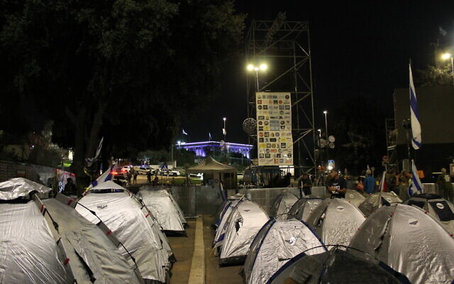 Ζητώντας εκλογές και την απελευθέρωση των αιχμαλώτων που κρατούνται στη Γάζα, μετά τη μαζική αντικυβερνητική διαδήλωση το βράδυ της Κυριακής, εγκατέστησαν σκηνές ξεκινώντας έτσι μια τετραήμερη εκδήλωση διαμαρτυρίας στην πρωτεύουσα του Ισραήλ.