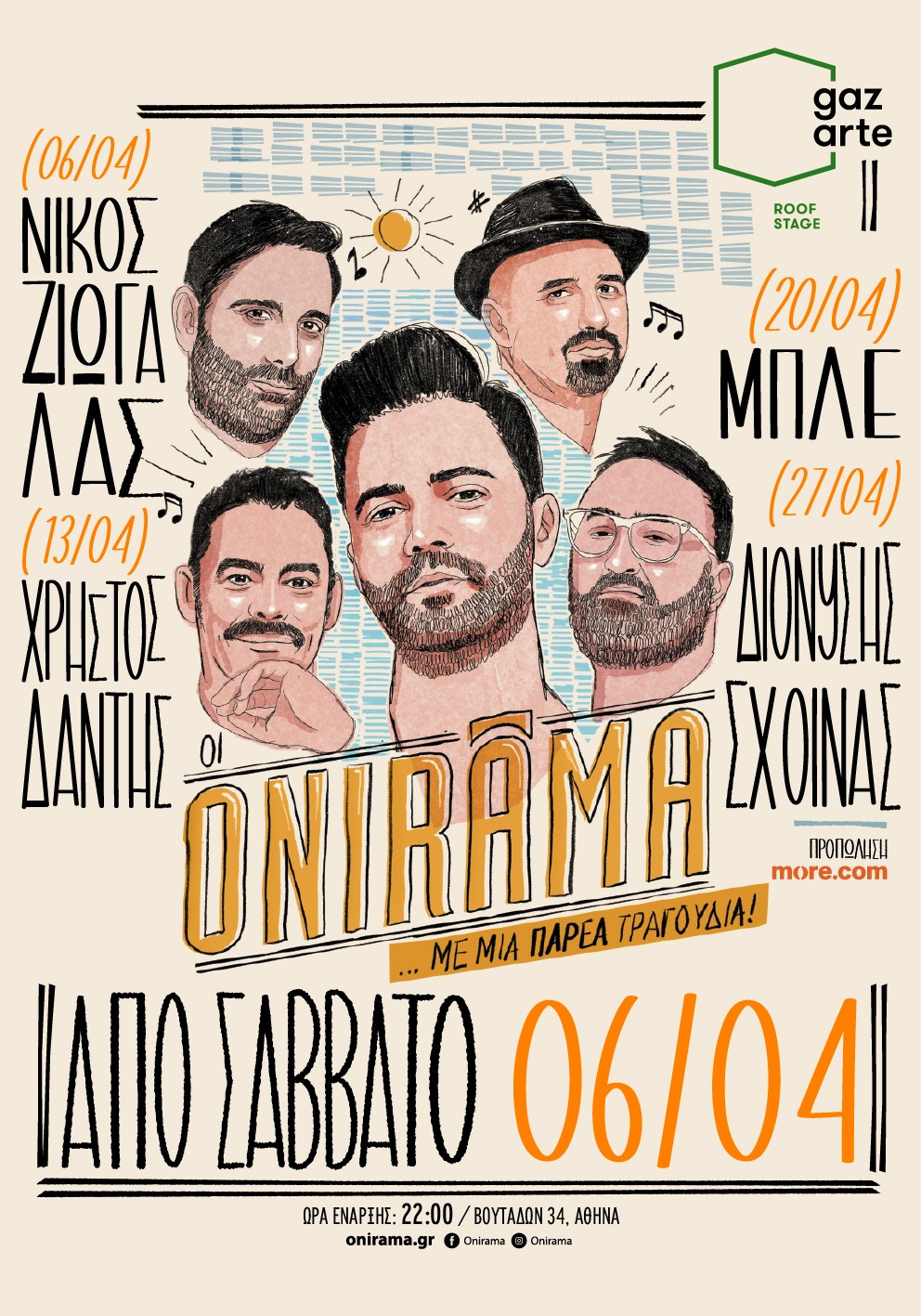 Οι Onirama, μετά τις εξαιρετικά επιτυχημένες εμφανίσεις τους τον περασμένο χειμώνα, επιστρέφουν στο Roof Stage του Gazarte. Από το Σάββατο 6 Απριλίου, έρχονται ανανεωμένοι, με νέους καλεσμένους και «με μια παρέα τραγούδια» για να χαρίσουν μοναδικά ταξίδια και στον κόσμο της μουσικής.