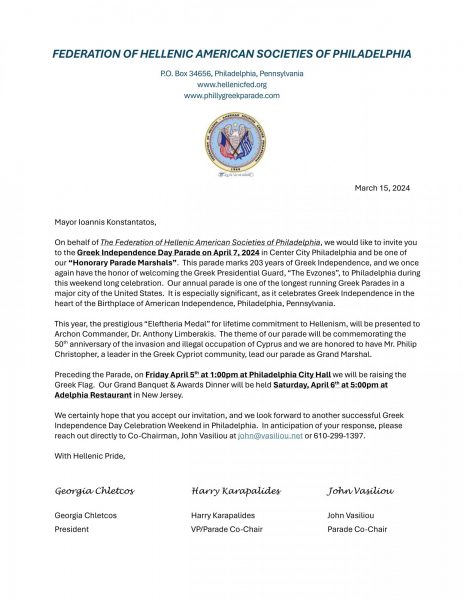Με ιδιαίτερη λαμπρότητα και υπερηφάνεια, θα γιορτάσουν μαζί με την Ομοσπονδία Ελληνοαμερικανικών Κοινωνιών της Φιλαδέλφειας την «Greek Independence Day Parade» στις 7 Απριλίου, ανοίγοντας την παρέλαση με τους Εύζωνες μας και δίνοντας τον παλμό της Ελευθερίας στους απανταχού Ομογενείς.