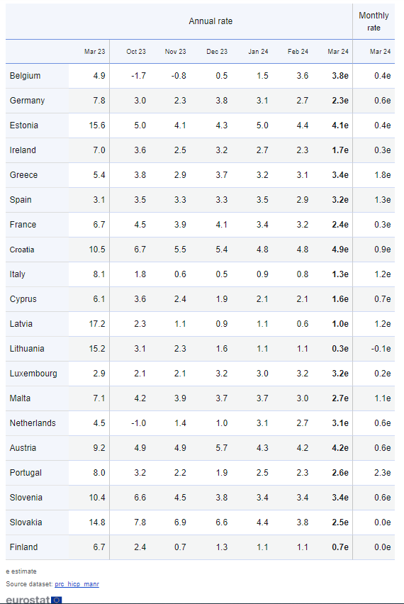 Στην Ιταλία, τρίτη μεγαλύτερη οικονομία του μπλοκ, ο πληθωρισμός είχε ήδη πέσει κάτω από το 2% τον Οκτώβριο. Τα νέα στοιχεία της Παρασκευής έδειξαν επιτάχυνση στο 1,3% από 0,8% που ήταν τον Φεβρουάριο, αλλά χαμηλότερα από τις εκτιμήσεις για 1,5%.