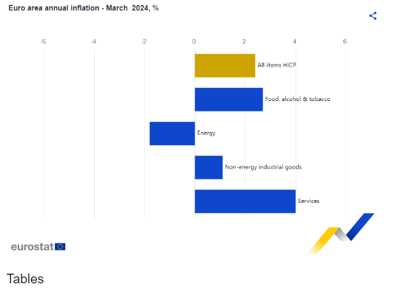 Εξετάζοντας τις κύριες συνιστώσες του πληθωρισμού της ζώνης του ευρώ, οι υπηρεσίες αναμένεται να έχουν τον υψηλότερο ετήσιο ρυθμό τον Μάρτιο (4,0%, σταθερός σε σχέση με τον Φεβρουάριο), ακολουθούμενες από τα τρόφιμα, το αλκοόλ και τον καπνό (2,7%, έναντι 3,9% τον Φεβρουάριο), τα μη ενεργειακά βιομηχανικά αγαθά (1,1%, έναντι 1,6% τον Φεβρουάριο) και την ενέργεια (-1,8%, έναντι -3,7% τον Φεβρουάριο).