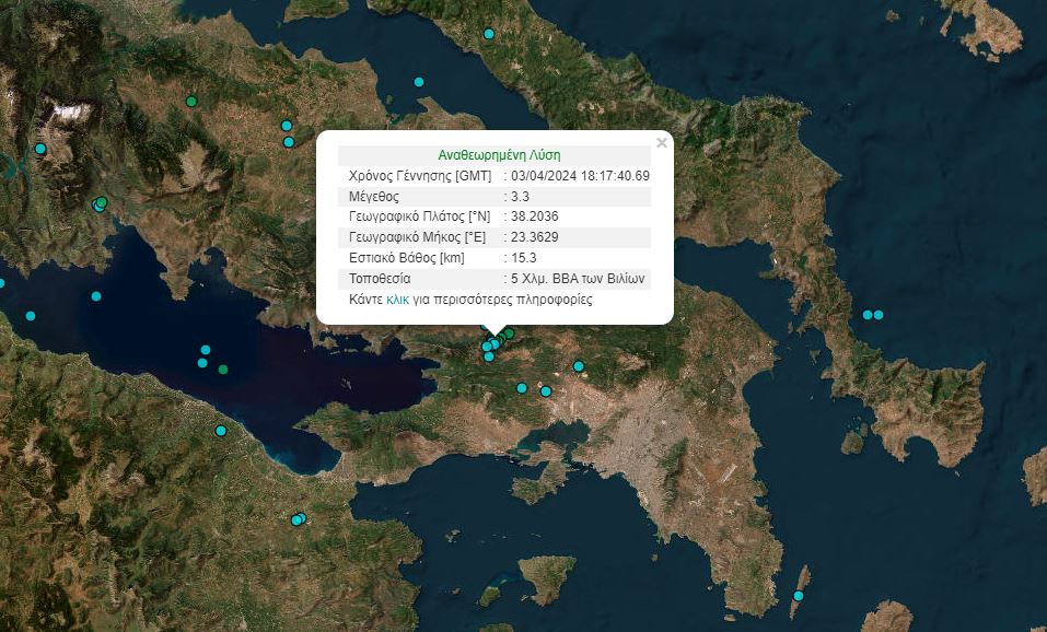Σεισμός, μεγέθους 3,3 βαθμών στην κλίμακα Ρίχτερ, σημειώθηκε το βράδυ της Τετάρτης (3/4) στα Βίλια.