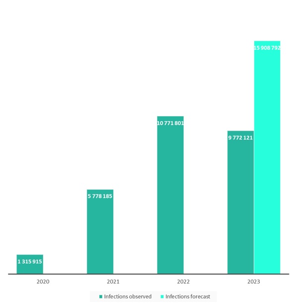 Ο αριθμός των μολύνσεων με κακόβουλο λογισμικό που κλέβει δεδομένα, 2020-2023. Πηγή: Kaspersky Digital Footprint Intelligence