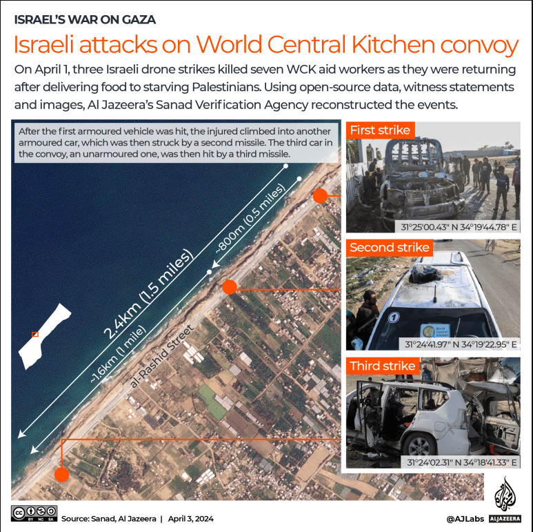 Οι εικόνες που ελήφθησαν από τις τοποθεσίες των βομβαρδισμών δείχνουν ότι τα οχήματα ήταν σαφώς σημειωμένα στην οροφή και το παρμπρίζ τους με το σήμα της WCK, υποδεικνύοντας ότι είχε προηγηθεί συντονισμός μεταξύ της οργάνωσης και του ισραηλινού στρατού σχετικά με τις μετακινήσεις.
