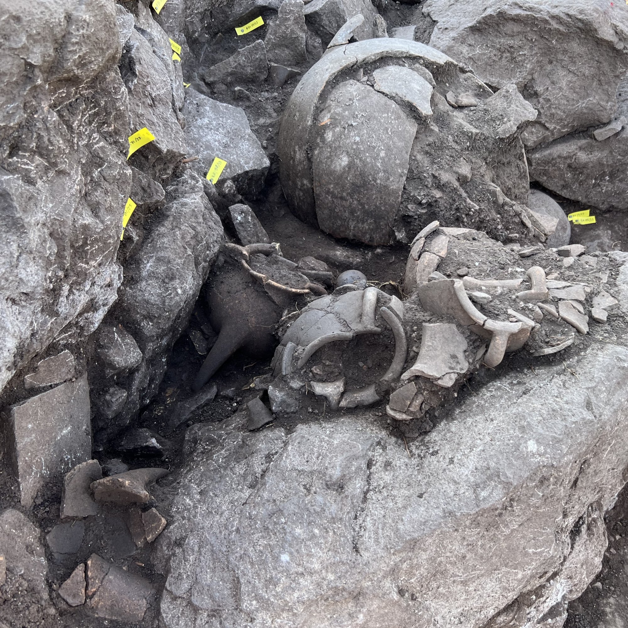 Τρεις μυκηναϊκές τριποδικές χύτρες, ένας ακόμα μαγειρικός σκεύος με επίπεδη βάση και ένας πίθος.