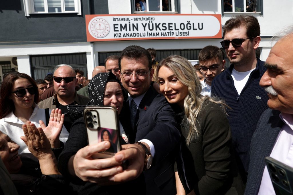 Ο δήμαρχος της Κωνσταντινούπολης, Εκρέμ Ιμάμογλου, συνοδευόμενος από τη σύζυγό του, Ντικέλ, βγάζει selfie με ψηφοφόρους του, ανήμερα των εκλογών της 31 Μαρτίου (REUTERS/Murad Sezer)
