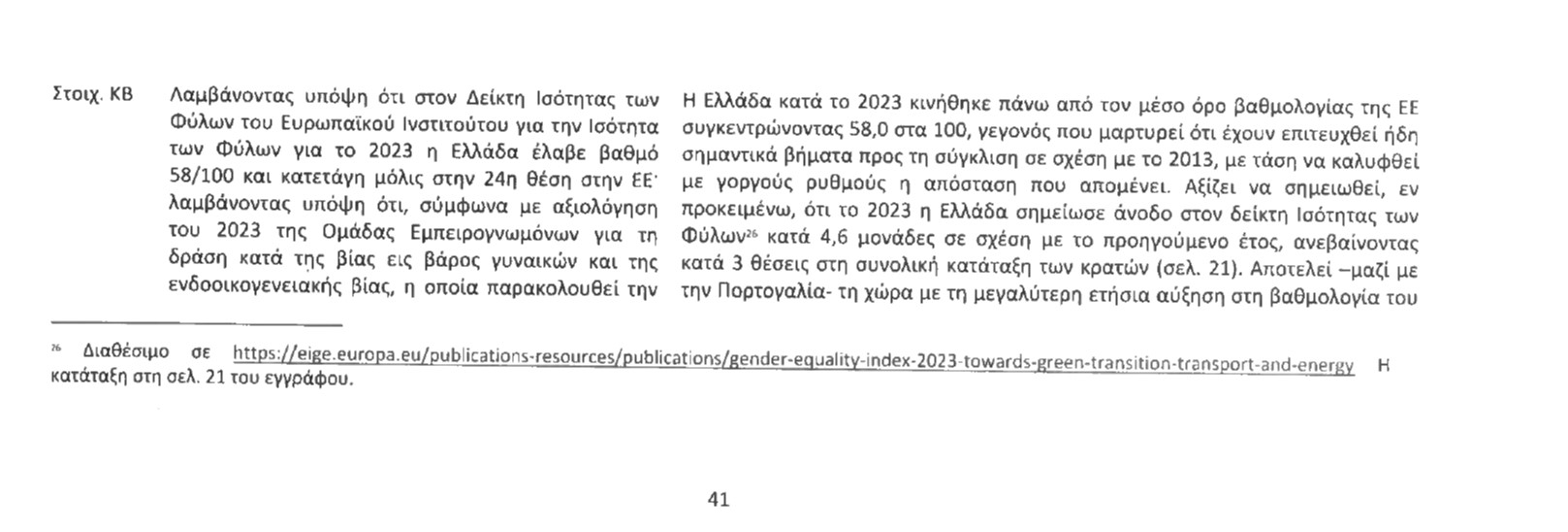 Να σημειώσουμε πως αν και η θέση της Ελλάδας στον Δείκτη Ισότητας των Φύλων παραμένει χαμηλή, η κυβέρνηση επιλέγει να δει τα πράγματα πιο… αισιόδοξα κάνοντας λόγο για «μικρή άνοδος σε σχέση με το 2022». Η Ελλάδα, συγκεκριμένα, μπορεί αν βρίσκεται πάνω από τον μέσο όρο κατακτώντας την 24η θέση ανάμεσα σε 27 με βαθμό 58 στα 100.