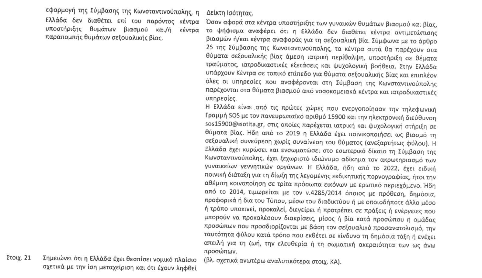 Στην απάντησή της η κυβέρνηση υποστηρίζει ότι «υπάρχουν Κέντρα σε τοπικό επίπεδο για θύματα σεξουαλικής βίας» και πως «όλες οι υπηρεσίες που αναφέρονται στη Σύμβαση της Κωνσταντινούπολης παρέχονται στα θύματα βιασμού από νοσοκομειακά κέντρα και ιατροδικαστικές υπηρεσίες».