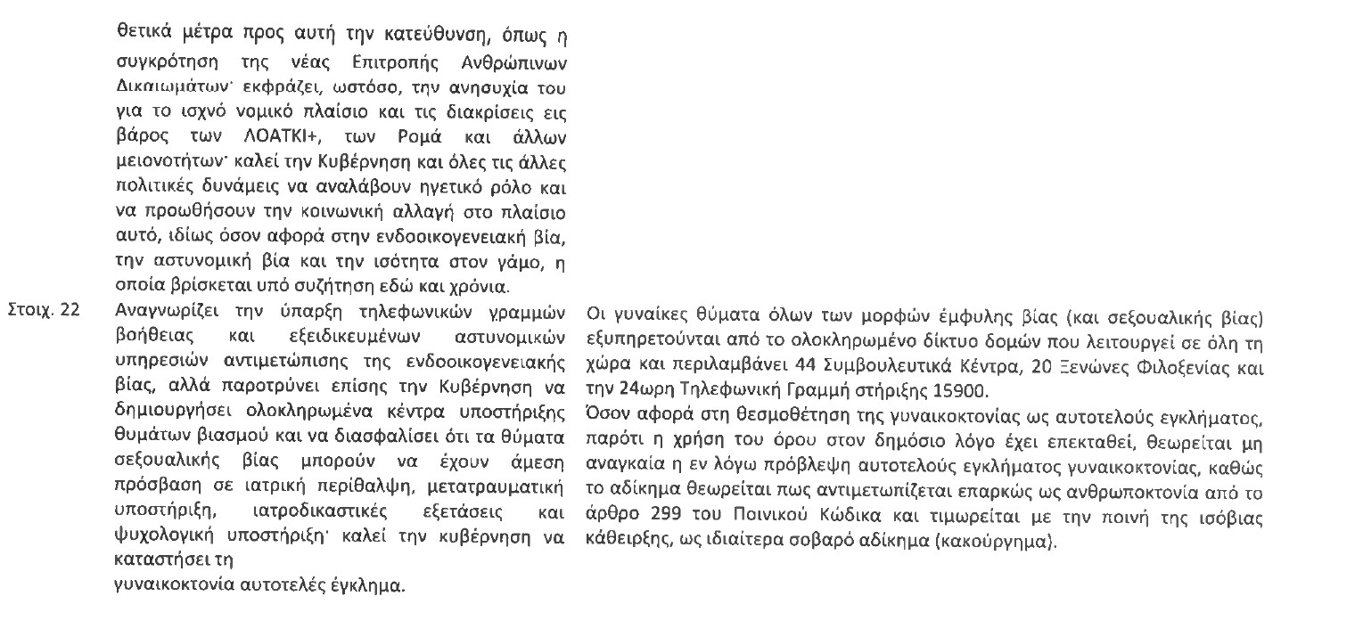 Η πρόοδος αυτή βέβαια, που γλίτωσε την Ελλάδα από την τελευταία θέση, επισκιάζεται από περιστατικά έμφυλης βίας και γυναικοκτονιών που το κράτος δεν κατάφερε να παράσχει βοήθεια στα θύματα.