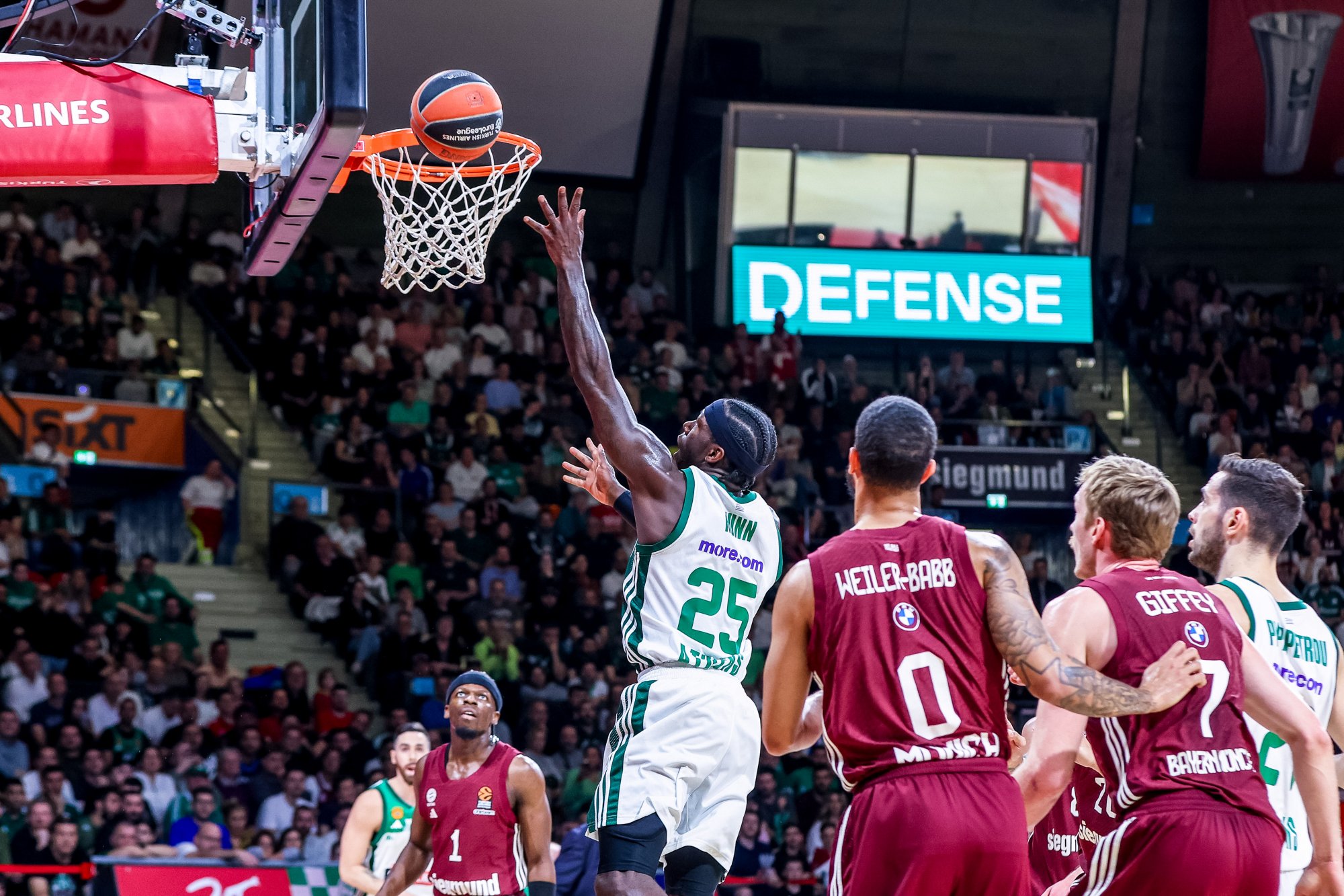 Ο Παναθηναϊκός προηγήθηκε με +7 (61-54) στο 31′ δείχνοντας να ελέγχει το παιχνίδι, όμως η Μπάγερν είχε άλλη άποψη. Οι παίκτες του Λάσο έτρεξαν ένα επιμέρους 11-2 με τον Μπολμάρο πρωταγωνιστή και βρέθηκαν στο +2 (65-63) στο 33′. Οι Πράσινοι κατάφεραν να περάσουν ξανά μπροστά, αλλά η Μπάγερν ισοφάρισε σε 70-70 στο 35′. Ένα 5-0 του Παναθηναϊκού όμως έφερε το «τριφύλλι» στο +5 (75-70) στο 36′. Η ομάδα του Αταμάν έκανε στο φινάλε σωστή διαχείριση και μπόρεσε να πάρει έτσι τη νίκη με το τελικό 82-75.