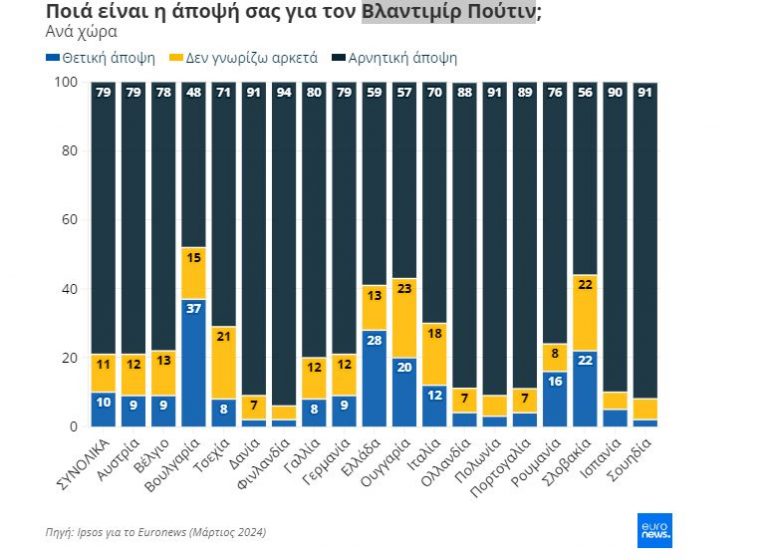 Οι αρνητικές κρίσεις για τον Ρώσο πρόεδρο πέφτουν κάτω από το όριο του 60% μόνον σε τέσσερις χώρες: την Βουλγαρία (49%), την Σλοβακία (56%), την Ουγγαρία (57%) και την Ελλάδα (59%).