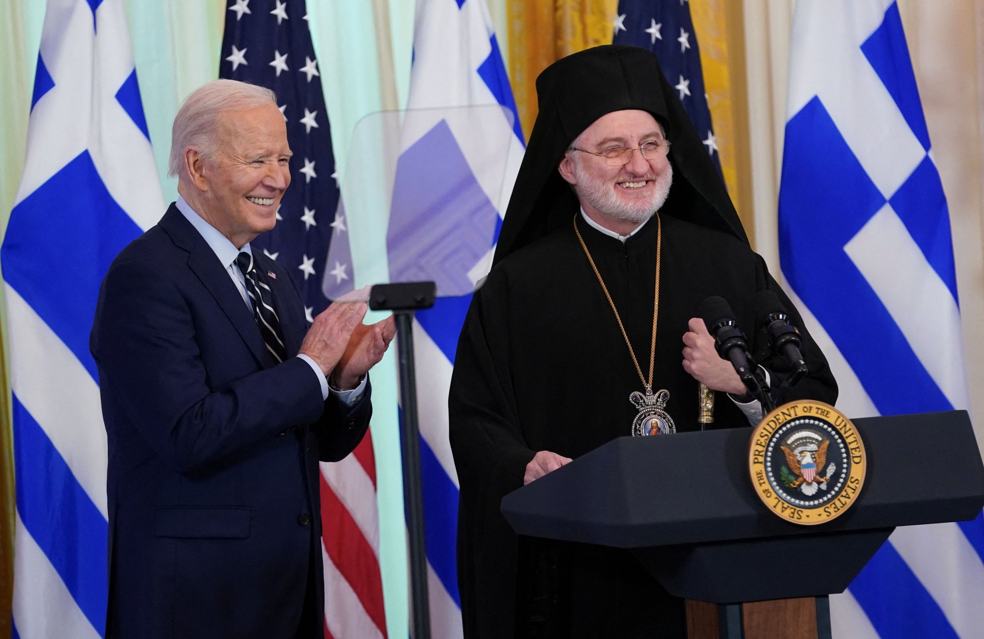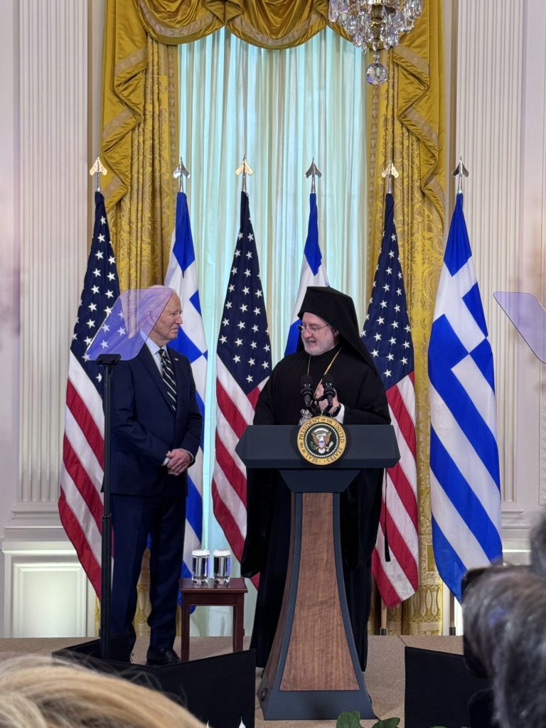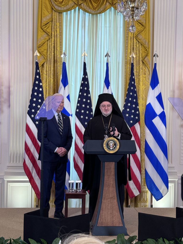 Επίσης, ως παιδιά της Μητέρας Εκκλησίας της Κωνσταντινούπολης, της οποίας ο αδιαμφισβήτητος ηγέτης, ο Παναγιώτατος Οικουμενικός Πατριάρχης κ.κ. Βαρθολομαίος, σας υπολογίζει ως έναν αληθινό φίλο – έχουμε έναν λόγο για ακόμη περισσότερη ευγνωμοσύνη. Σας ευχαριστούμε για την ισχυρή υποστήριξή σας στην πνευματική αποστολή του Οικουμενικού Πατριαρχείου, μια αποστολή αγάπης, ειρήνης και ελπίδας που χρειάζεται τώρα περισσότερο από ποτέ. Κύριε πρόεδρε σας ευχαριστούμε για την αφοσίωσή σας στην Ελλάδα και την Κύπρο. Είμαστε στο πλευρό σας όπως εσείς είστε στο πλευρό μας. Ζήτω η Αμερική, ζήτω το ελληνικό έθνος», κατέληξε ο Αρχιεπίσκοπος Αμερικής.