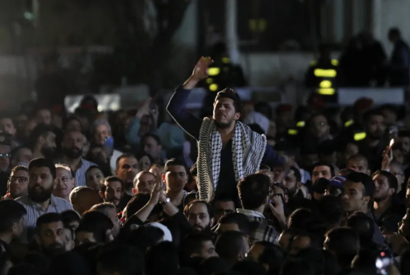 Άνθρωποι διαδηλώνουν υπέρ των Παλαιστινίων στη Γάζα κοντά στην ισραηλινή πρεσβεία στο Αμμάν