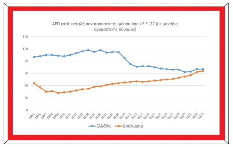 Το 2023 η Βουλγαρία «μετράει» 64 μονάδες ενώ η Ελλάδα στην Ε.Ε. των «27» βρίσκεται στις 67 μονάδες.