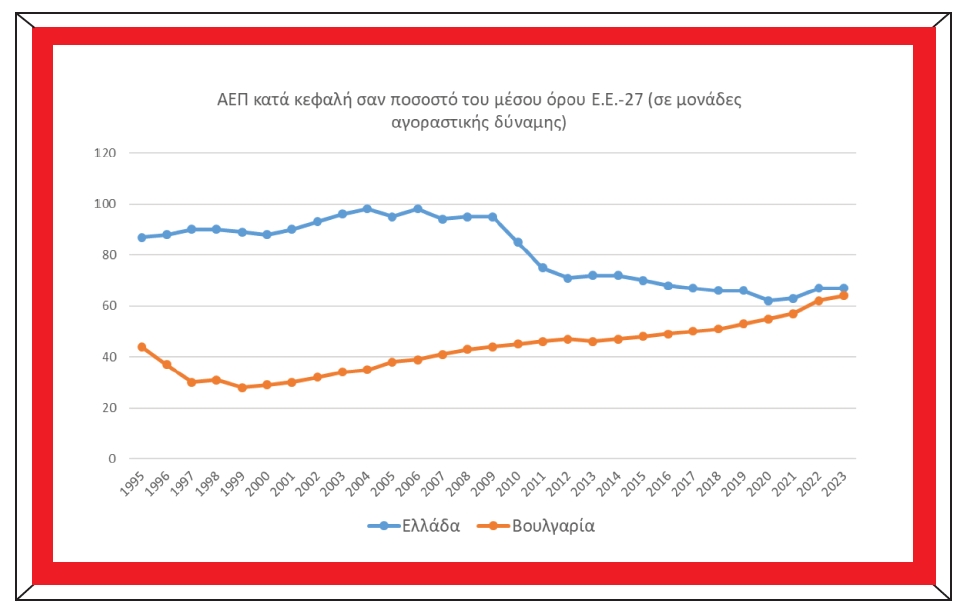 Το 2023 η Βουλγαρία «μετράει» 64 μονάδες ενώ η Ελλάδα στην Ε.Ε. των «27» βρίσκεται στις 67 μονάδες.
