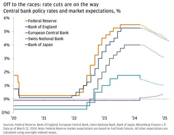 Αλλά ήρθε μια συντονισμένη «χορωδία» από τις κεντρικές τράπεζες, που έδειχνε ότι ο δρόμος τη χαλάρωσης έχει ανοίξει. Η Εθνική Τράπεζα της Ελβετίας (SNB) έγραψε ιστορία ως η πρώτη ανεπτυγμένη κεντρική τράπεζα της αγοράς που πραγματοποίησε μείωση επιτοκίων σε αυτόν τον κύκλο. Η Ομοσπονδιακή Τράπεζα των ΗΠΑ επιβεβαίωσε ότι εξακολουθεί να σχεδιάζει να μειώσει τα επιτόκια τρεις φορές φέτος, ακόμη και με ισχυρότερη ανάπτυξη και πιο επίμονο πληθωρισμό στο μυαλό.