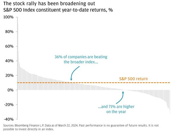 Ο S&P 500 έχει σημειώσει 20 υψηλά όλων των εποχών μέχρι στιγμής φέτος. Μετά από μια μακρά περίοδο δύο ετών, αυτό σημαίνει ότι στο 35% των ημερών συναλλαγών του 2024 έχει σημειώσει νέο ρεκόρ. Η καλύτερη ανάπτυξη, ο μέτριος πληθωρισμός και η χαλάρωση της Fed είναι η συνταγή για εταιρικά κέρδη και με τη σειρά τους, ευρύτερες αποδόσεις κεφαλαίων.