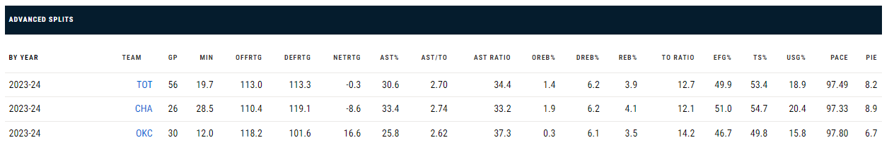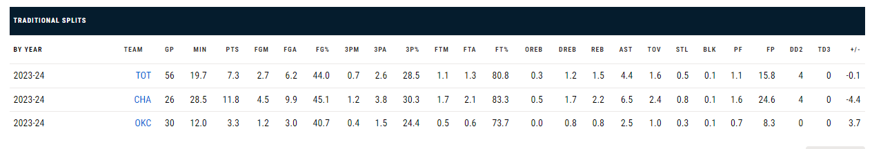 Η επιρροή του στο παιχνίδι της Σάρλοτ είναι μεγάλη και μετά την ανταλλαγή του δείχνει και με το παραπάνω πως ήρθε στο ΝΒΑ για να… μείνει. Αν δει κανείς τη διαφορά στη σύγκριση των αριθμών του στους Θάντερ και τους Χόρνετς είναι η μέρα με τη νύχτα. Στην Οκλαχόμα είχε 30 παιχνίδια και συνολικά 12 λεπτά μέσο όρο με 3,3 πόντους, 2,5 ασίστ και μόλις 0,8 ριμπάουντ. Στους Χόρνετς τα νούμερα είναι υπέρδιπλάσια, ενώ ο χρόνος συμμετοχής του είναι 28,5 λεπτά.