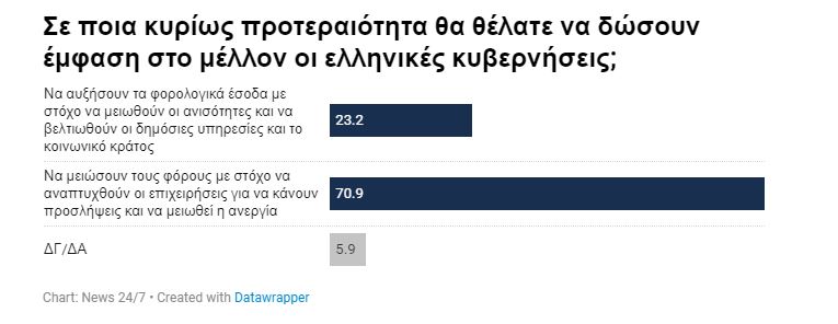 Στην ερώτηση για το ποια πρέπει να είναι η κύρια προτεραιότητα των ελληνικών κυβερνήσεων, η μείωση των φόρων με σκοπό την ανάπτυξη της επιχειρηματικότητας λαμβάνει το 70,9% των απαντήσεων, ενώ η αύξηση των φόρων με σκοπό την βελτίωση του κράτους και τη μείωση των ανισοτήτων λαμβάνει μόλις 23,2%.