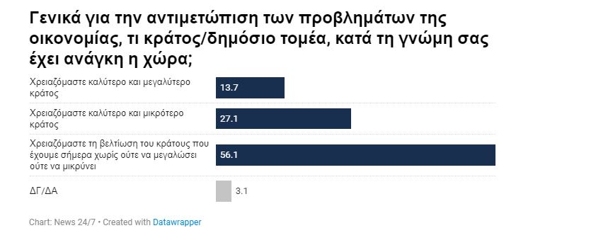 Το 56,1% εκφράζει την ανάγκη για την βελτίωση του κράτους όπως υπάρχει σήμερα, ενώ το 13,7% επιθυμεί ένα καλύτερο και μεγαλύτερο κράτος και το 27,1% ένα καλύτερο αλλά μικρότερο κράτος.