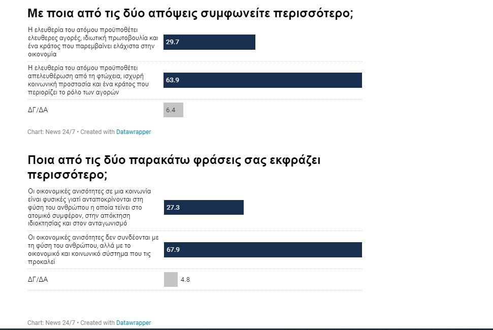 Οι αντιλήψεις για την ατομική ελευθερία για το 63,9% του συνόλου των ερωτώμενων συνδέονται με την απελευθέρωση από την φτώχεια, με την ισχυρή κοινωνική προστασία και με ένα κράτος το οποίο περιορίζει τις αγορές, ενώ για το 29,7% η ελευθερία του ατόμου προϋποθέτει ελεύθερες αγορές, ιδιωτική πρωτοβουλία και ένα κράτος το οποίο παρεμβαίνει ελάχιστα στην οικονομία.