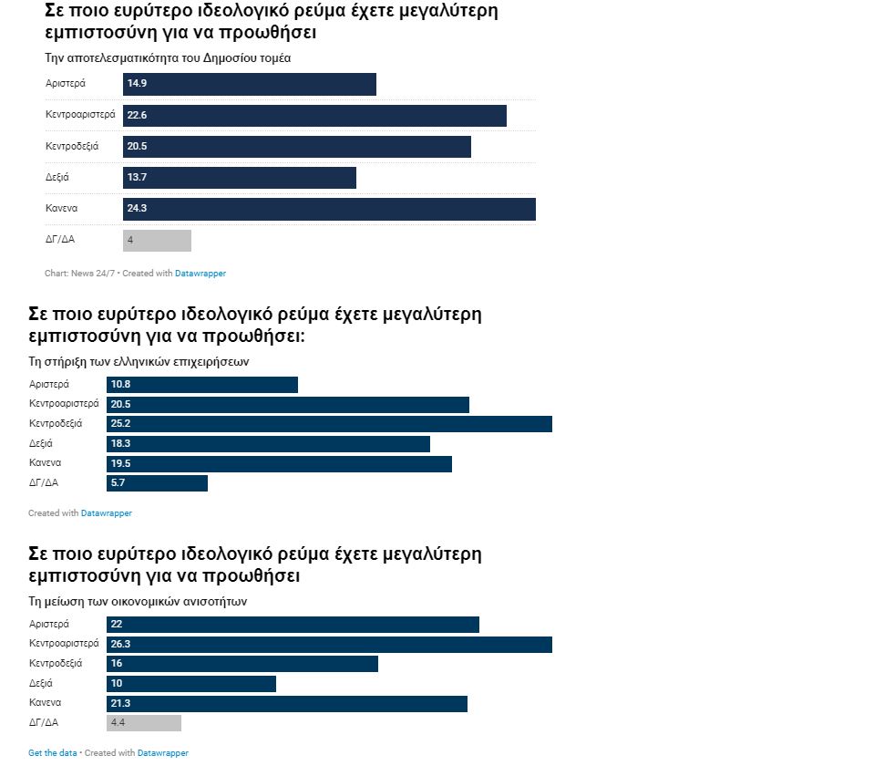 Τα ποσοστά των απαντήσεων σχεδόν συγκλίνουν στο ερώτημα «σε ποιο ευρύτερο ιδεολογικό ρεύμα έχετε μεγαλύτερη εμπιστοσύνη για να προωθήσει την αποτελεσματικότητα του Δημοσίου τομέα». Η Αριστερά και η Κεντροαριστερά είναι κατά τι πλειοψηφική δύναμη με ποσοστό 37,5% έναντι της Δεξιάς και Κεντροδεξιάς με ποσοστό 34,2%.