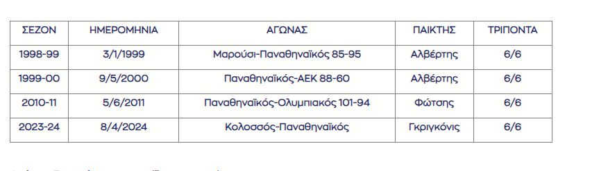 Σημείωσε την 29η επίδοση 6+ εύστοχων τριπόντων στην ιστορία του Παναθηναϊκού και την 1η μετά από έναν χρόνο. Ο τελευταίος που μπήκε σε αυτήν τη λίστα ήταν ο Ντουέιν Μπέικον που είχε 6/12 τρίποντα στις 25 Μαρτίου 2023 στο εκτός έδρας παιχνίδι με την ΑΕΚ.