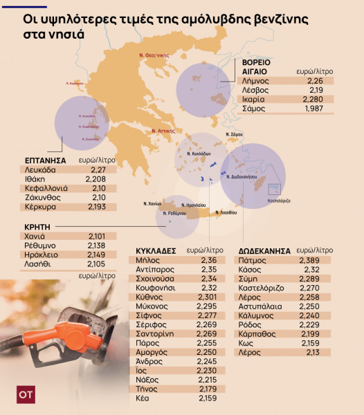 Στα νησιά δε, όπως φαίνεται και από τα στοιχεία του Παρατηρητηρίου Τιμών Υγρών Καυσίμων που δημοσιεύει ο ΟΤ, η αμόλυβδη χτυπά ακόμη και τα 2,36 ευρώ ανά λίτρο. Όταν η μέση πανελλαδική τιμής της βενζίνης βρίσκεται στα 1,961 ευρώ ανά λίτρο. Η μεγάλη «ψαλίδα» αποδίδεται στις γνωστές παθογένειες της ελληνικής αγοράς: Υψηλό κόστος μεταφορικών, μικρός αριθμός εταιρειών εμπορίας πετρελαιοειδών και πρατηρίων στα νησιά κλπ.