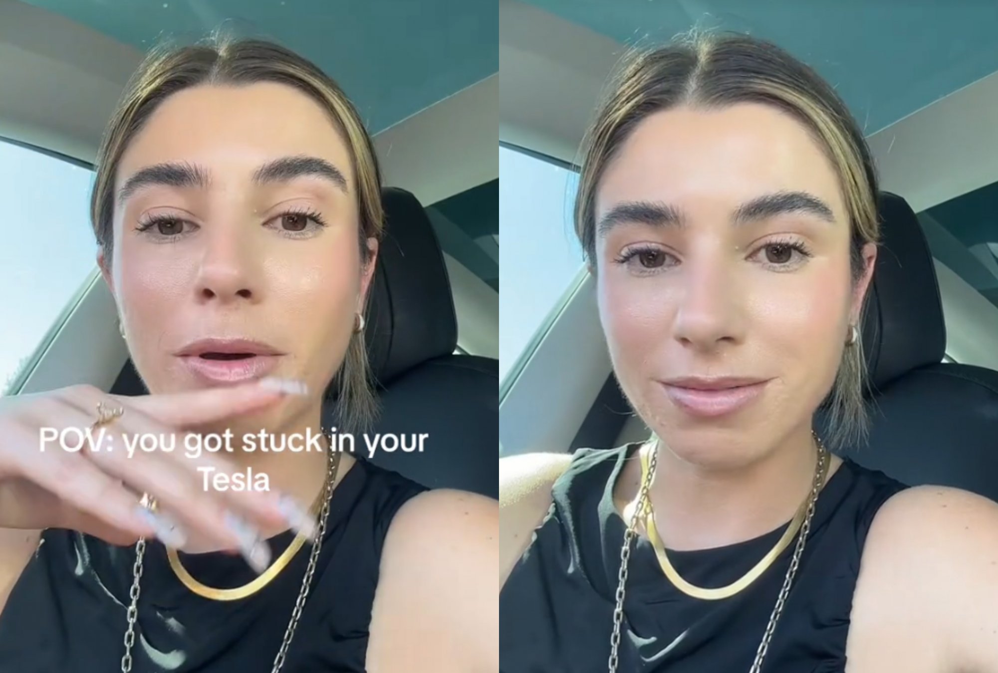 «Κατάφερα να βγω από το αυτοκίνητό μου. Κοιτάξτε, ιδρώνω. Κυριολεκτικά στάζω ιδρώτα. Μπορείτε να το δείτε στο πρόσωπό μου», λέει και συμπληρώνει: «Εγκλωβίστηκα στο αυτοκίνητό μου, καθώς η ενημέρωση λογισμικού κράτησε 40 λεπτά, και το εσωτερικό έχει 46 βαθμούς».