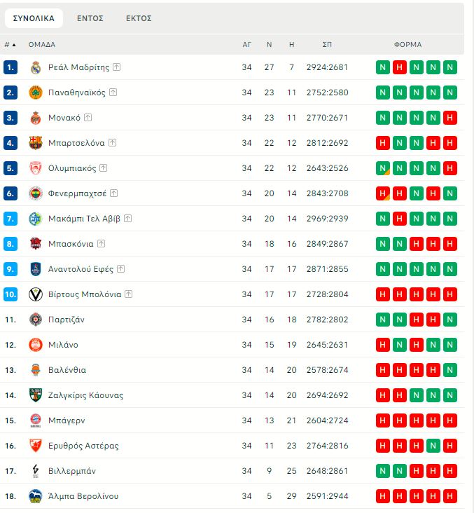 Η τελική βαθμολογία της κανονικής περιόδου της Euroleague (pic)