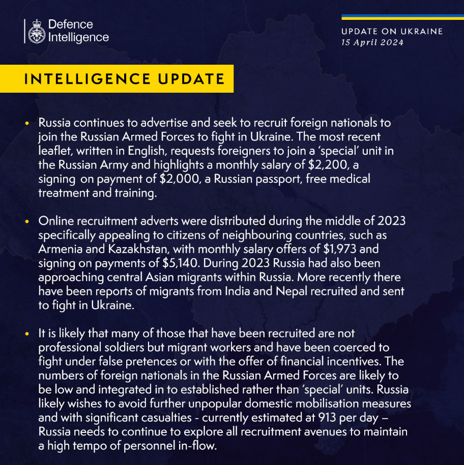 «Η Ρωσία πιθανότατα θέλει να αποφύγει περαιτέρω αντιδημοφιλή μέτρα επιστράτευσης στο εσωτερικό της. Δεδομένων των σημαντικών απωλειών – κατά μέσο όρο 913 στρατιώτες την ημέρα – η Ρωσική Ομοσπονδία διερευνά νέες ευκαιρίες για την ενίσχυση του προσωπικού των ενόπλων δυνάμεων», αναφέρει το βρετανικό υπουργείο Άμυνας.