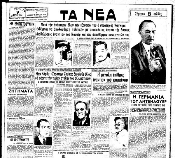 *Άρθρο για τον Κόνραντ Αντενάουερ, που έφερε τον τίτλο «Η Γερμανία του Αντενάουερ – Η χώρα που υπέταξε τους κατακτητάς της» και είχε δημοσιευτεί στην εφημερίδα «Τα Νέα» την Τρίτη 9 Μαρτίου 1954, ημέρα κατά την οποία ο γερμανός καγκελάριος επρόκειτο να πραγματοποιήσει επίσημη επίσκεψη στη χώρα μας.