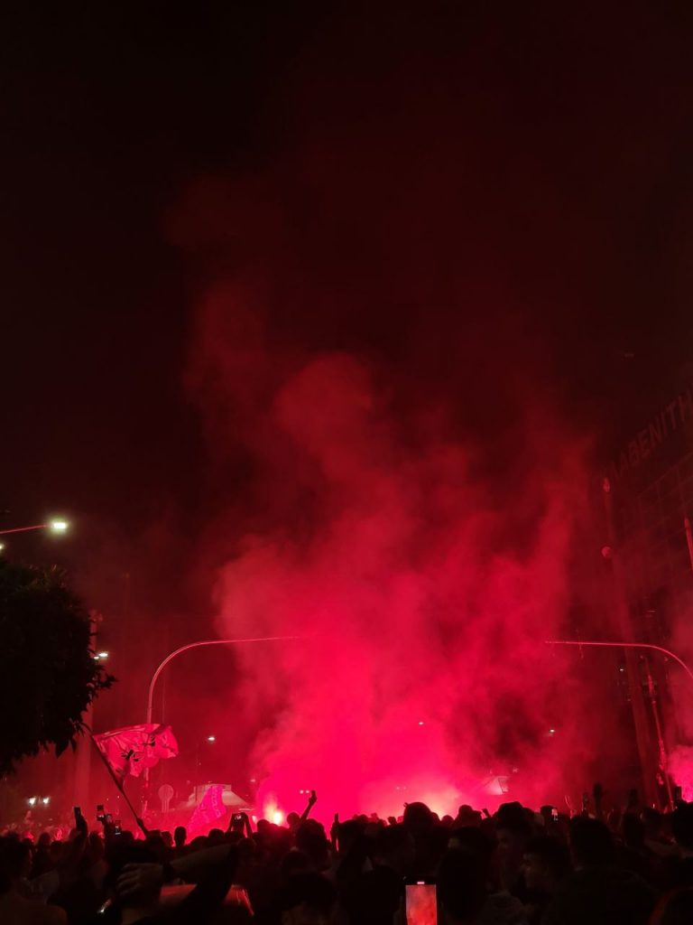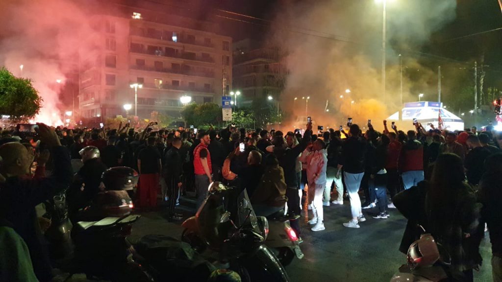 Το Πασαλιμάνι πήρε «φωτιά», με πλήθος φιλάθλων του Ολυμπιακού ξεχύνονται στους δρόμους και να πανηγυρίζουν την ιστορική πρόκριση της ομάδας τους.