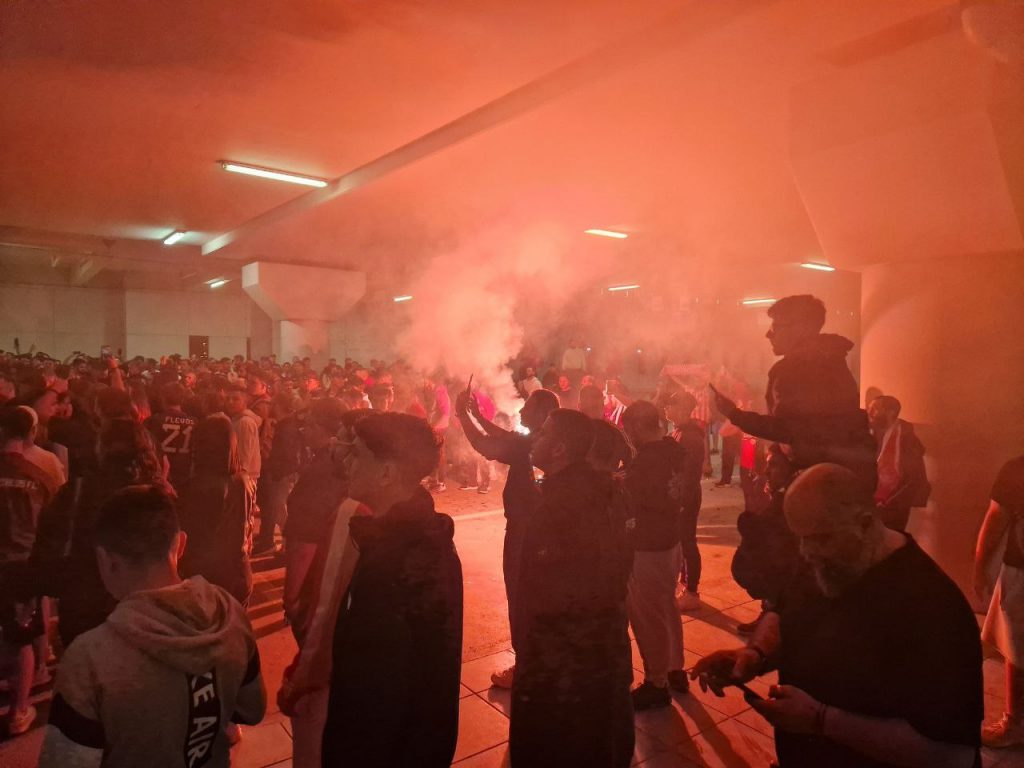 Ο πύρινος κόσμος του Ολυμπιακού ζει ανεπανάληπτες στιγμές και περιμένει πώς και πώς τις επόμενες κρίσιμες αναμετρήσεις των Πειραιωτών, σε αυτήν την ξέφρενη πορεία προς την προορισμό την κορυφή. Καπνογόνα κάνουν τη νύχτα μέρα.