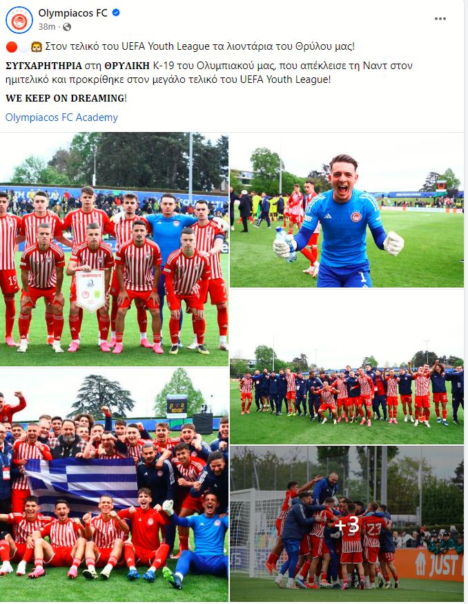 «Στον τελικό του UEFA Youth League τα λιοντάρια του Θρύλου μας. ΣΥΓΧΑΡΗΤΗΡΙΑ στη Θρυλική Κ-19 του Ολυμπιακού μας, που απέκλεισε τη Ναντ στον ημιτελικό και προκρίθηκε στον μεγάλο τελικό του UEFA. Youth League. WE KEEP ON DREAMING», ανέφερε η ΠΑΕ.