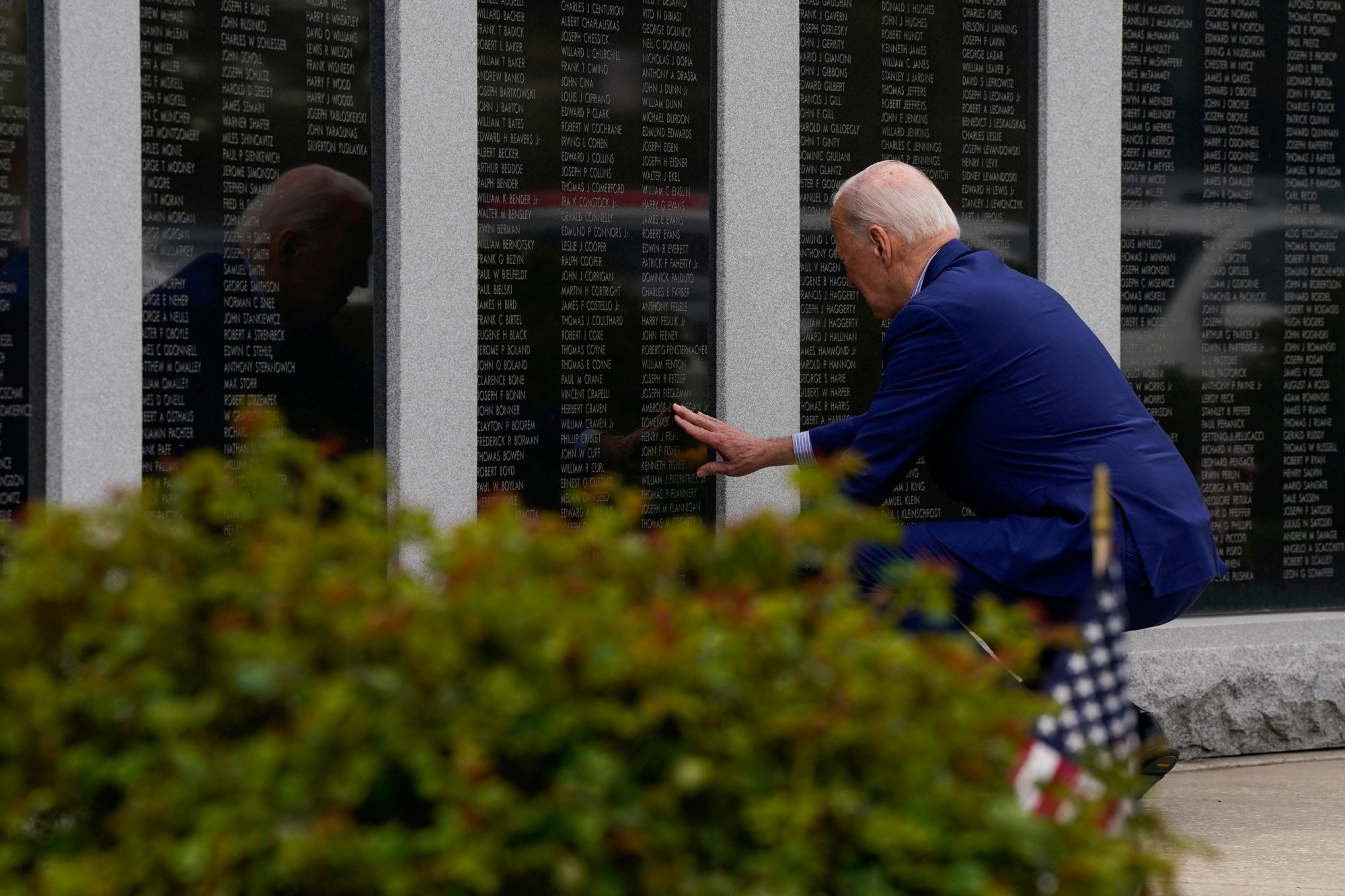 Ο πρόεδρος των ΗΠΑ Τζο Μπάιντεν συνοδευόμενος από τη δήμαρχο του Σκράντον, Πέιτζ Γκέμπχαρντ Κονέτι, καθώς επισκέπτονται ένα πολεμικό μνημείο με το όνομα του θείου του, Αμπρόουζ Τζ. Φίνεγκαν Τζούνιορ, ο οποίος πέθανε στον Β’ Παγκόσμιο Πόλεμο (Πηγή: REUTERS/Elizabeth Frantz)