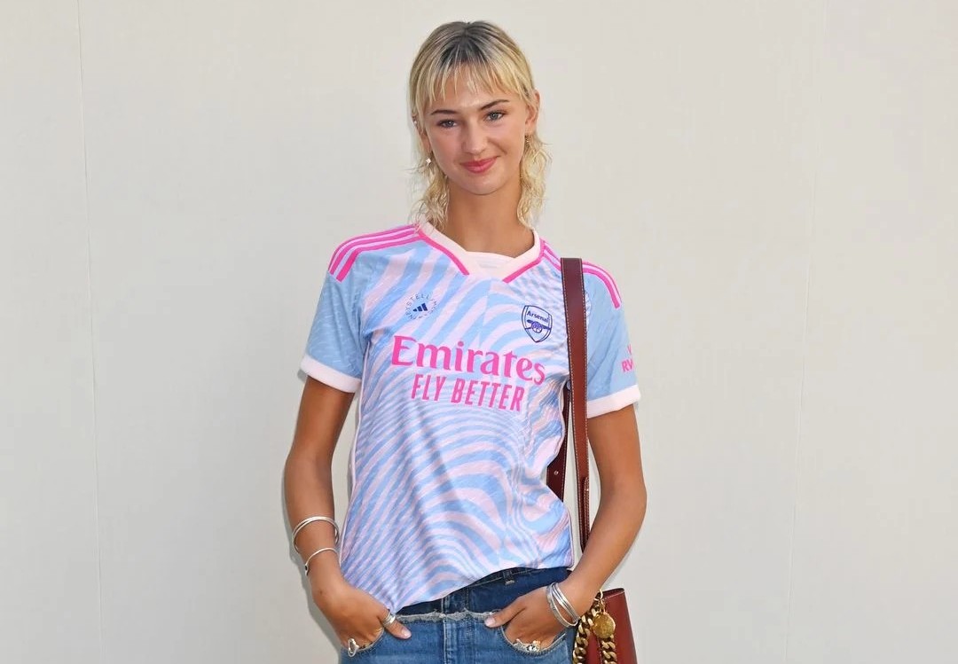 Το μοντέλο Mia Regan έκανε το ντεμπούτο της στη συνεργασία της Stella McCartney με την Arsenal στην τελευταία της καμπάνια, φορώντας ένα μπλε και ροζ μπλουζάκι που έμοιαζε με παλιό σχέδιο φανέλας.