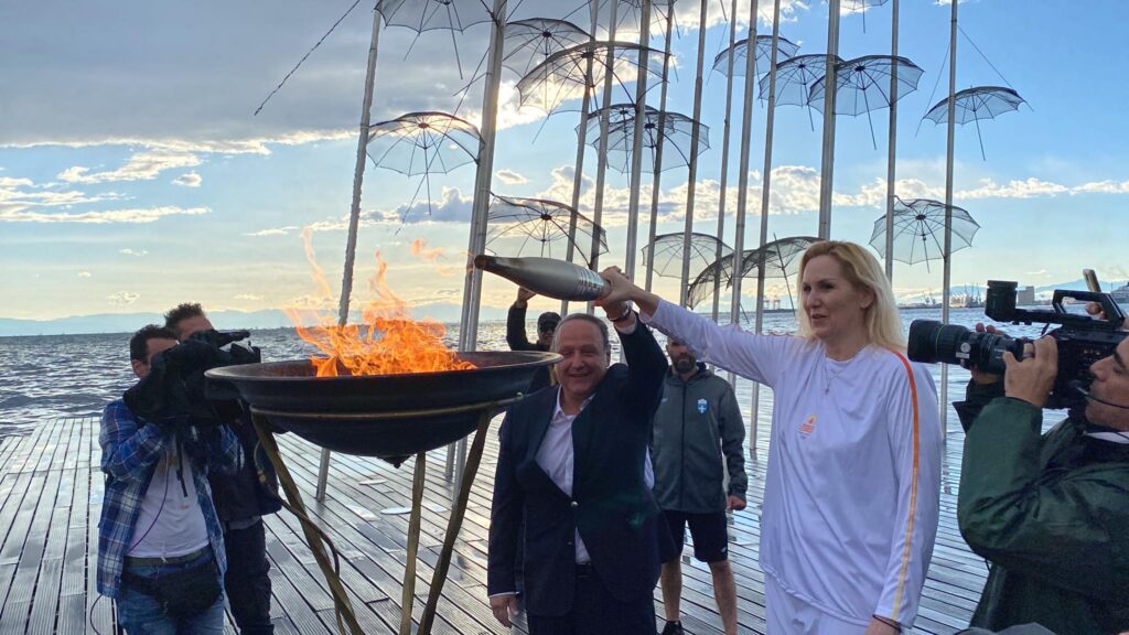 Η λαμπαδηδρόμος και Ολυμπιονίκης, κ. Τασούλα Κελεσίδου, άναψε την Ολυμπιακή Φλόγα μαζί με τον δήμαρχο Θεσσαλονίκης, κ. Στέλιο Αγγελούδη, δίπλα από τις εμβληματικές Ομπρέλες της Θεσσαλονίκης και με το πλήθος να ξεσπά σε χειροκροτήματα.