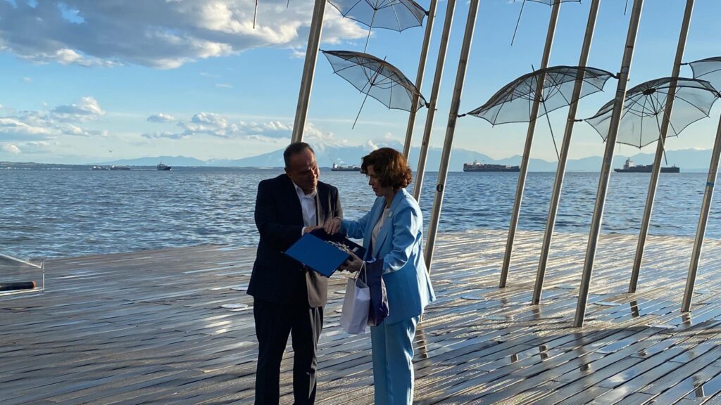 Αριστερά ο δήμαρχος Θεσσαλονίκης Στέλιος Αγγελούδης, δεξιά η πρέσβης της Γαλλίας στην Ελλάδα Λόρενς Οέρ