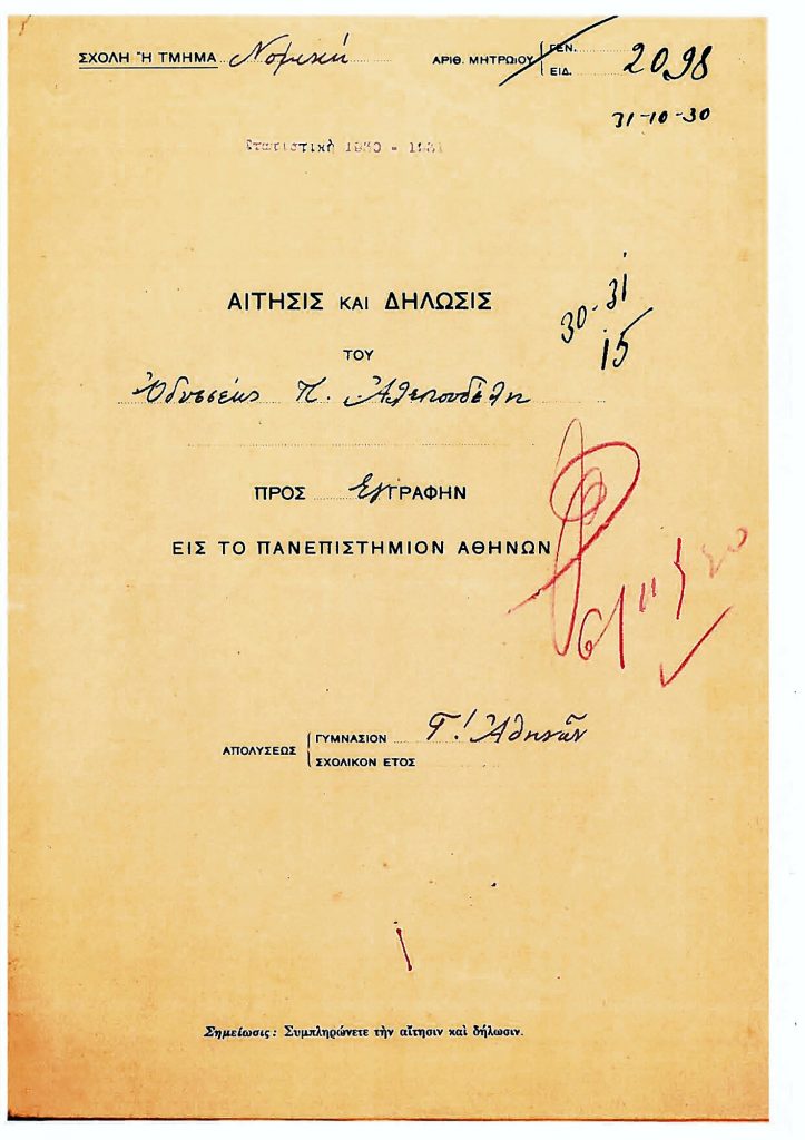 Η «αίτηση και δήλωση» του Οδυσσέα Ελύτη για εγγραφή στη Νομική Σχολή του Πανεπιστημίου Αθηνών